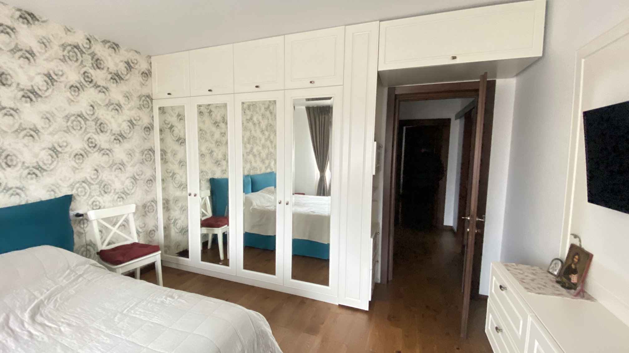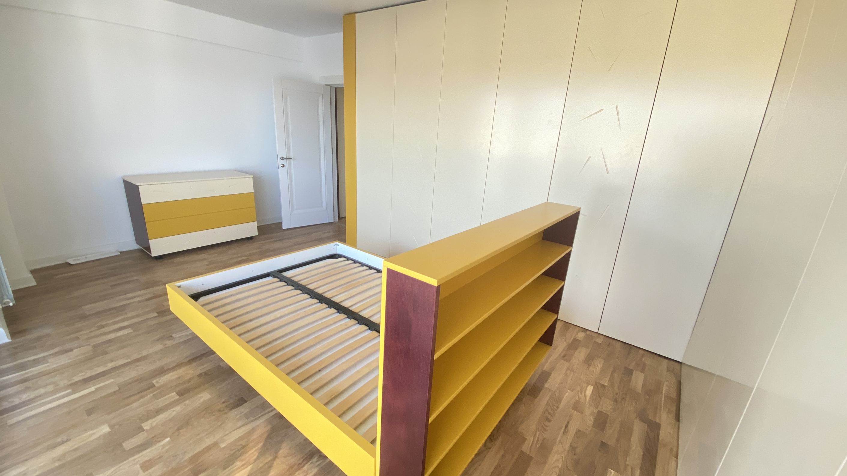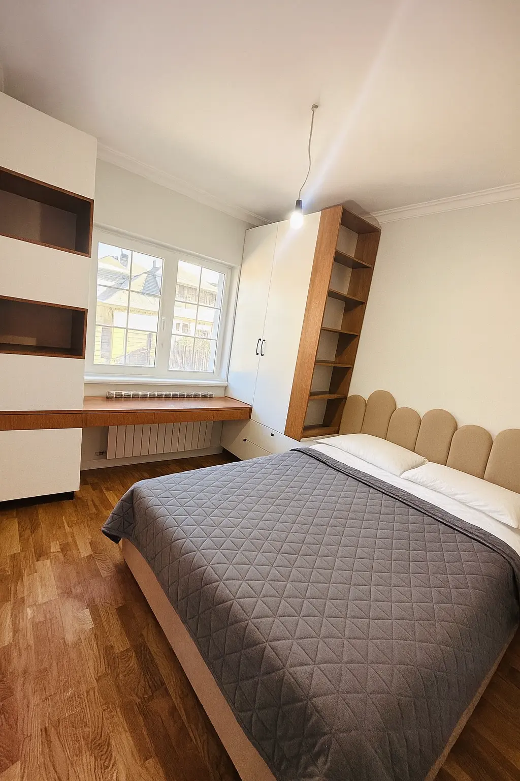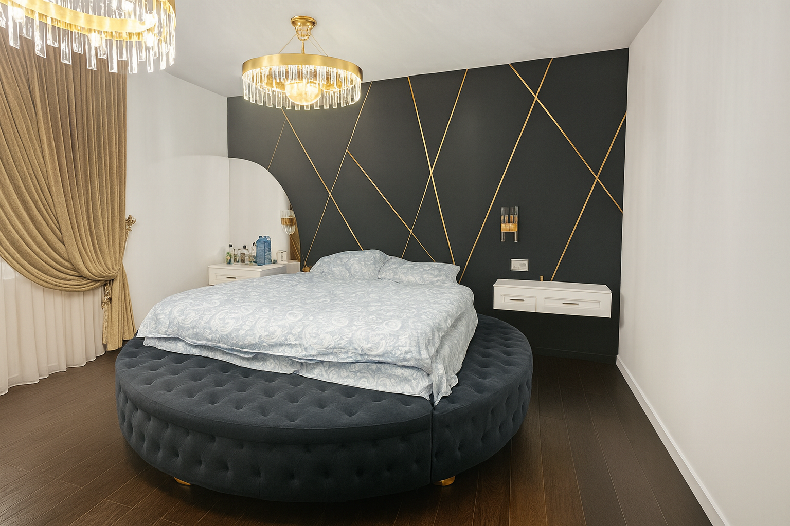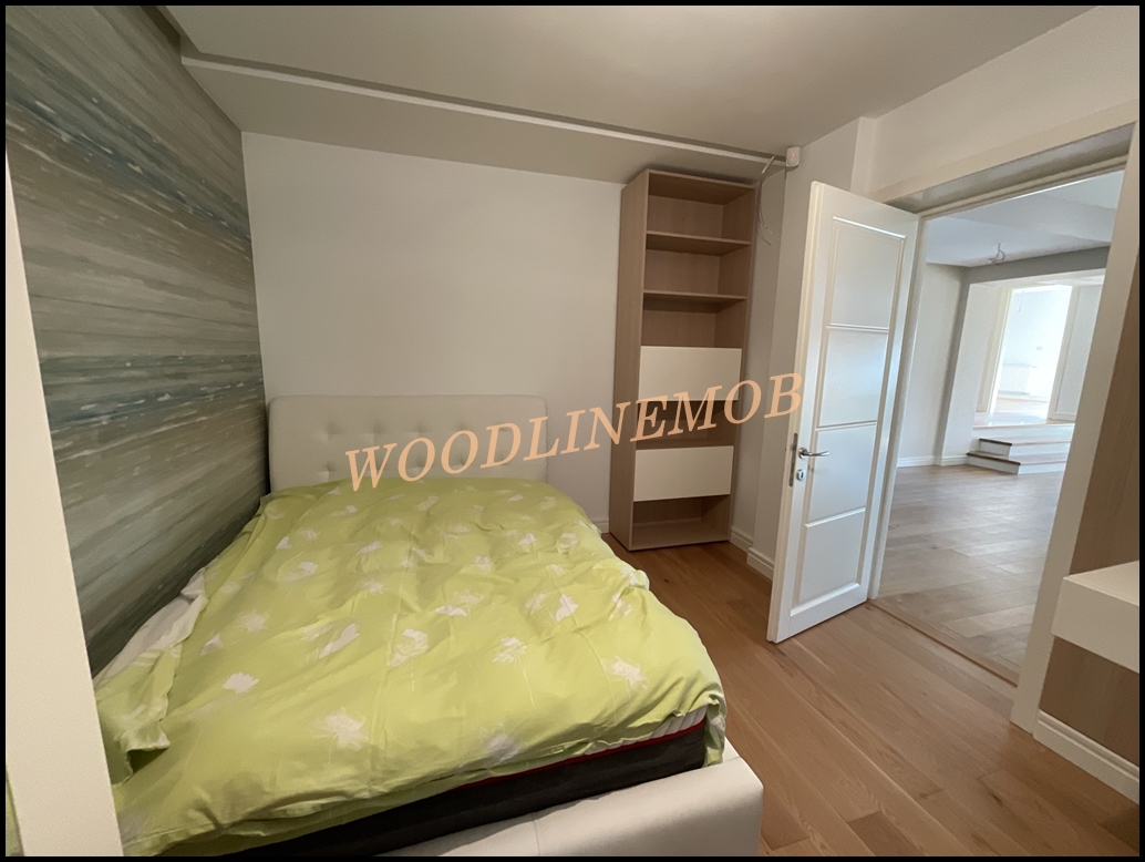 Caracterizat prin linii drepte și elemente decorative într-o simetrie ordonată, dormitorul devine locul preferat atunci când dormim sau ne încărcăm bateriile. Patul, cu eleganța sa, devine piesa centrală a dormitorului, invitând la relaxare și un somn liniștit. În același timp, poziționarea strategică a dressingului, care se abate de la tiparul tradițional, completează organizarea eficientă a spațiului de depozitare.