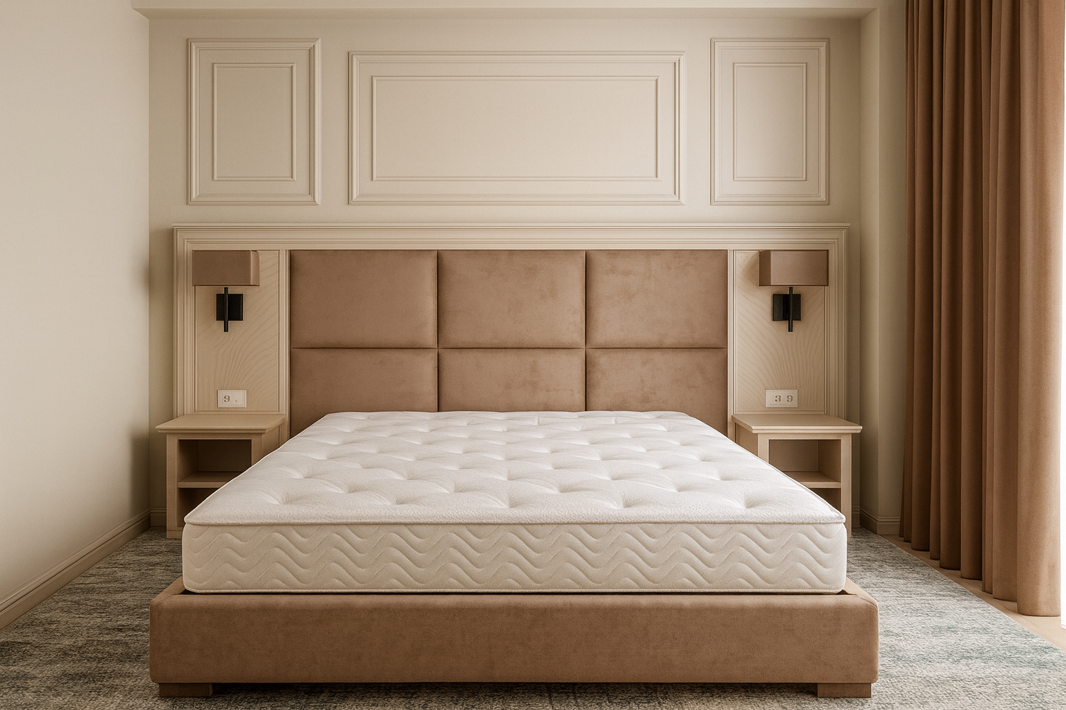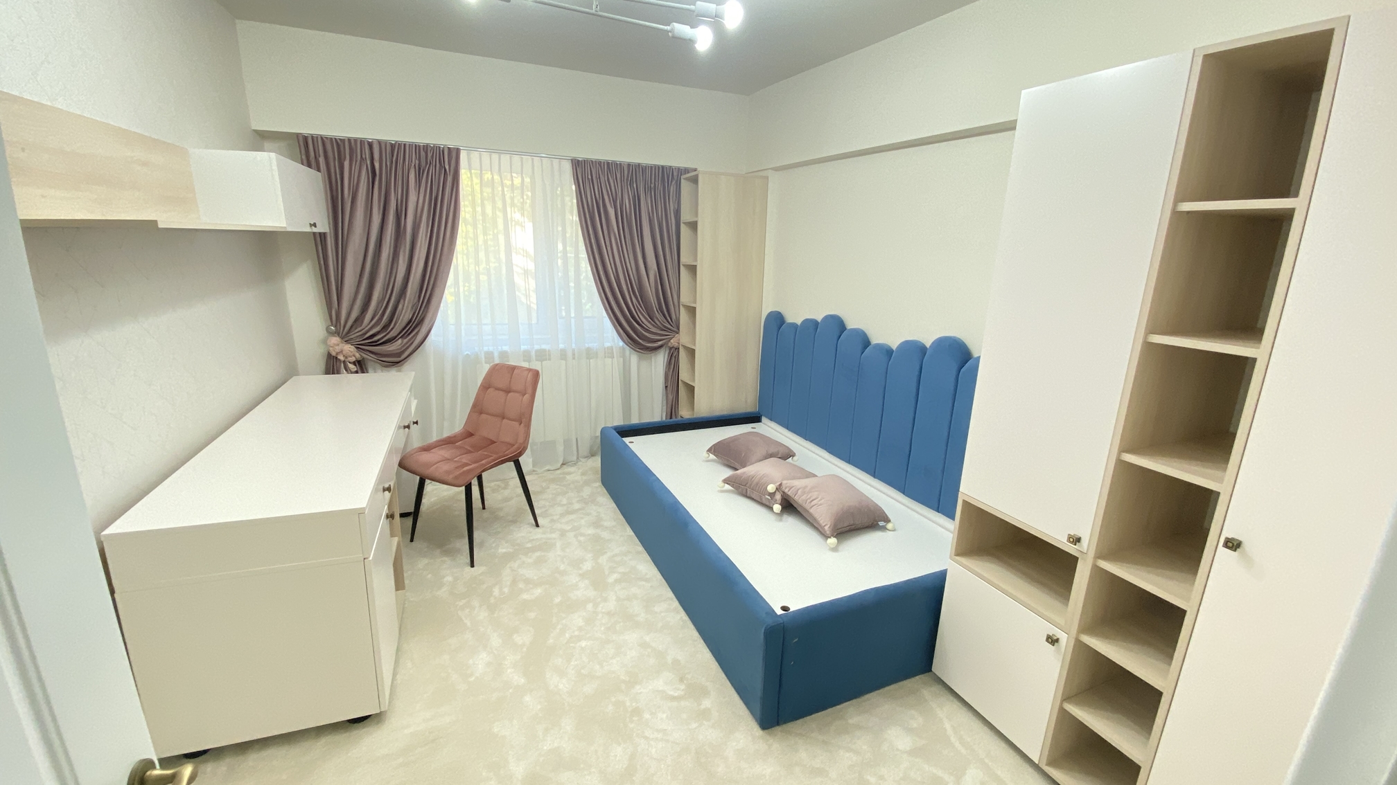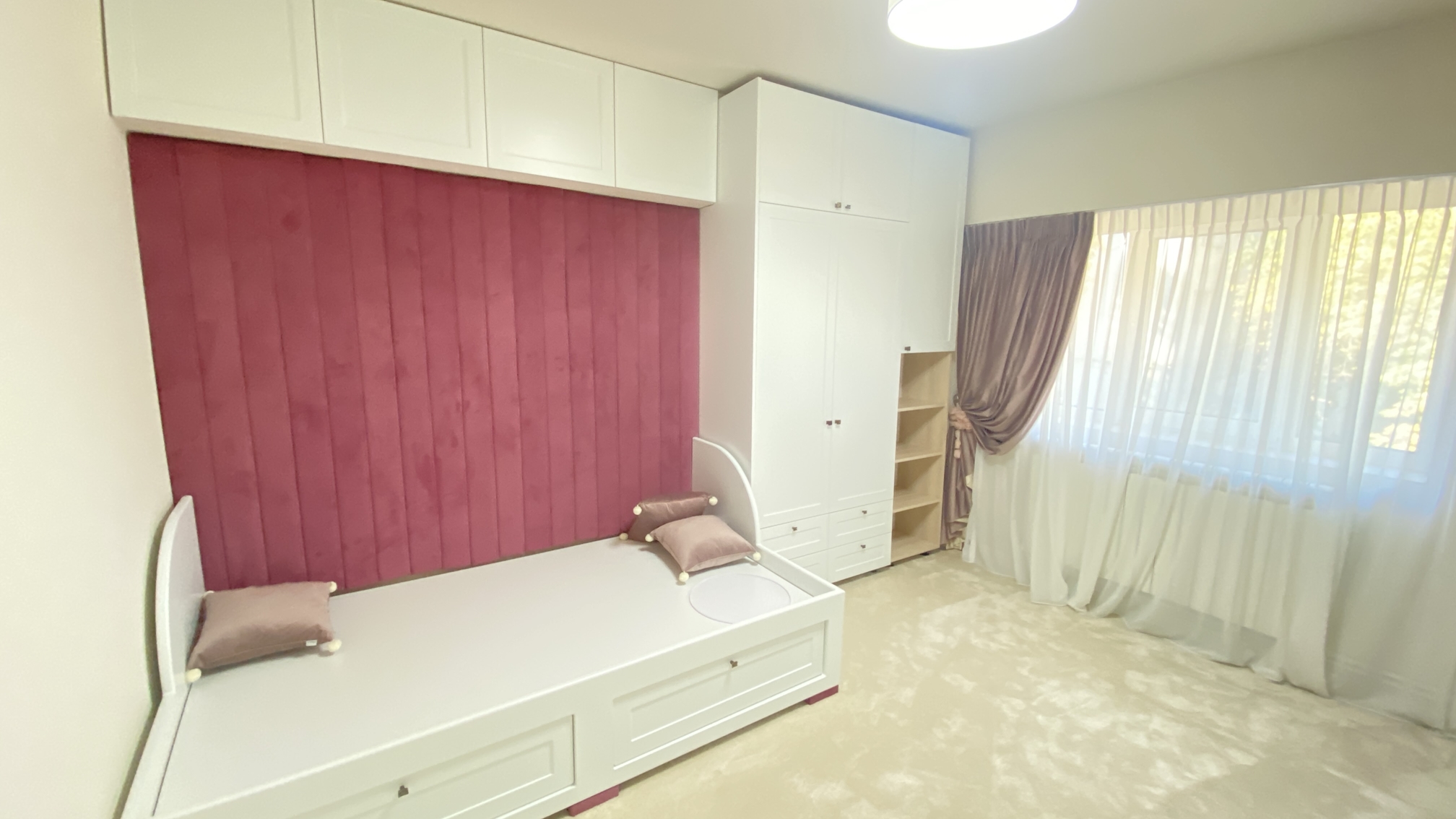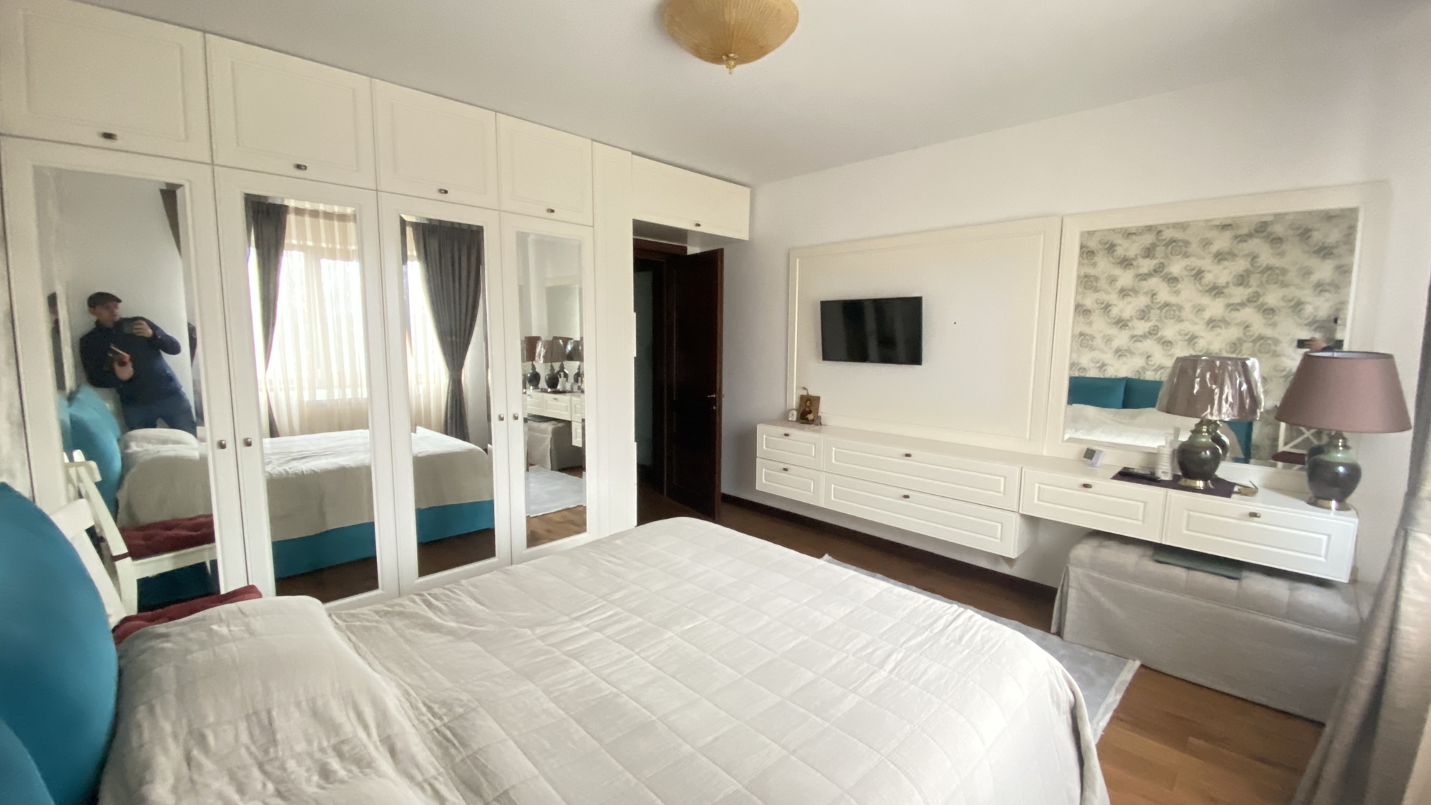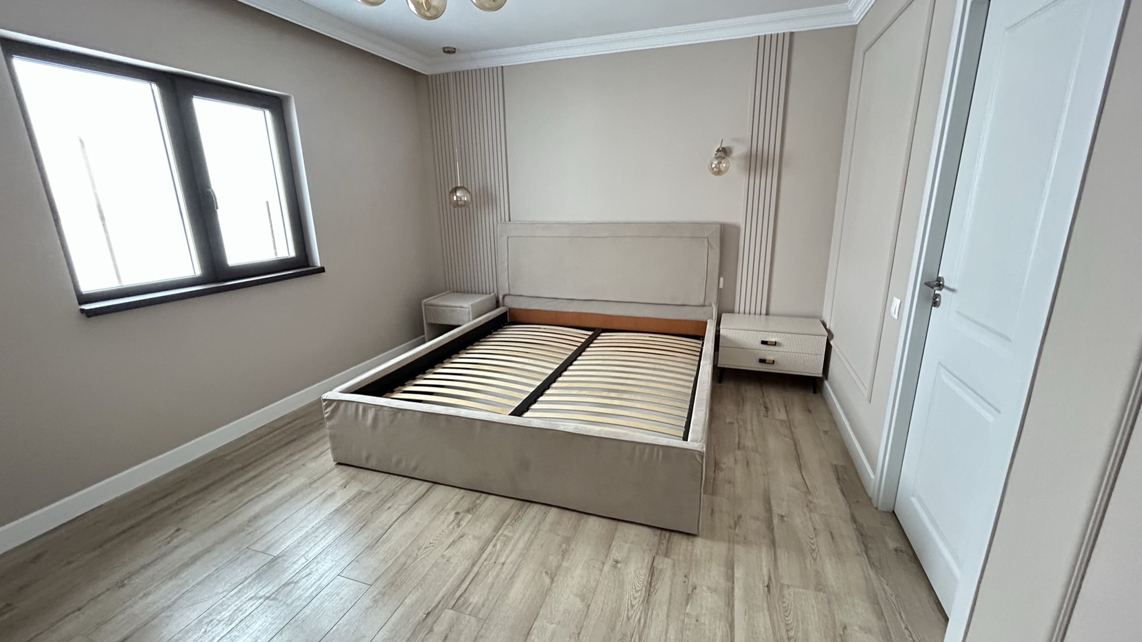 Caracterizat prin linii drepte și elemente decorative într-o simetrie ordonată, dormitorul devine locul preferat atunci când dormim sau ne încărcăm bateriile. Patul, cu eleganța sa, devine piesa centrală a dormitorului, invitând la relaxare și un somn liniștit. În același timp, poziționarea strategică a dressingului, care se abate de la tiparul tradițional, completează organizarea eficientă a spațiului de depozitare.