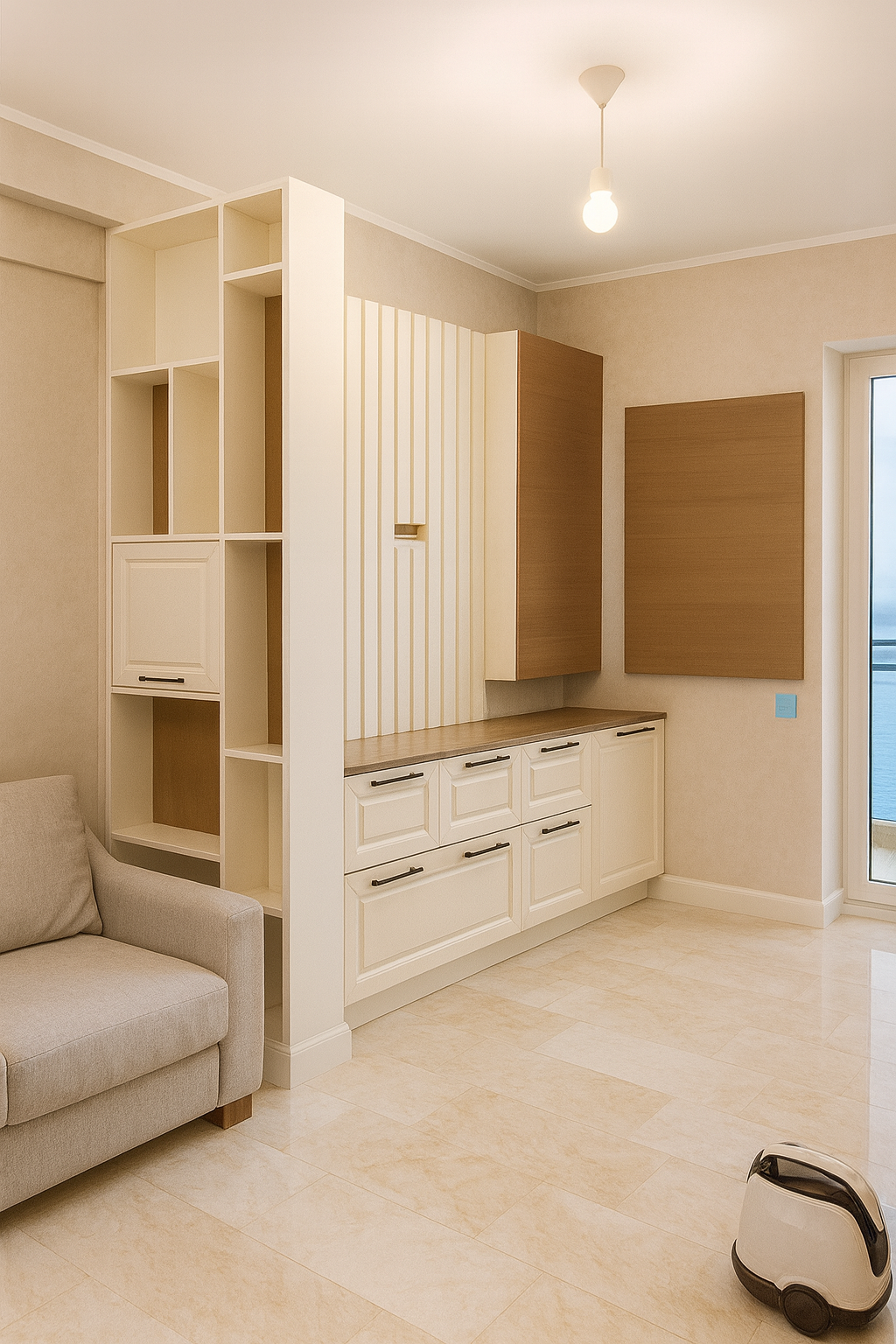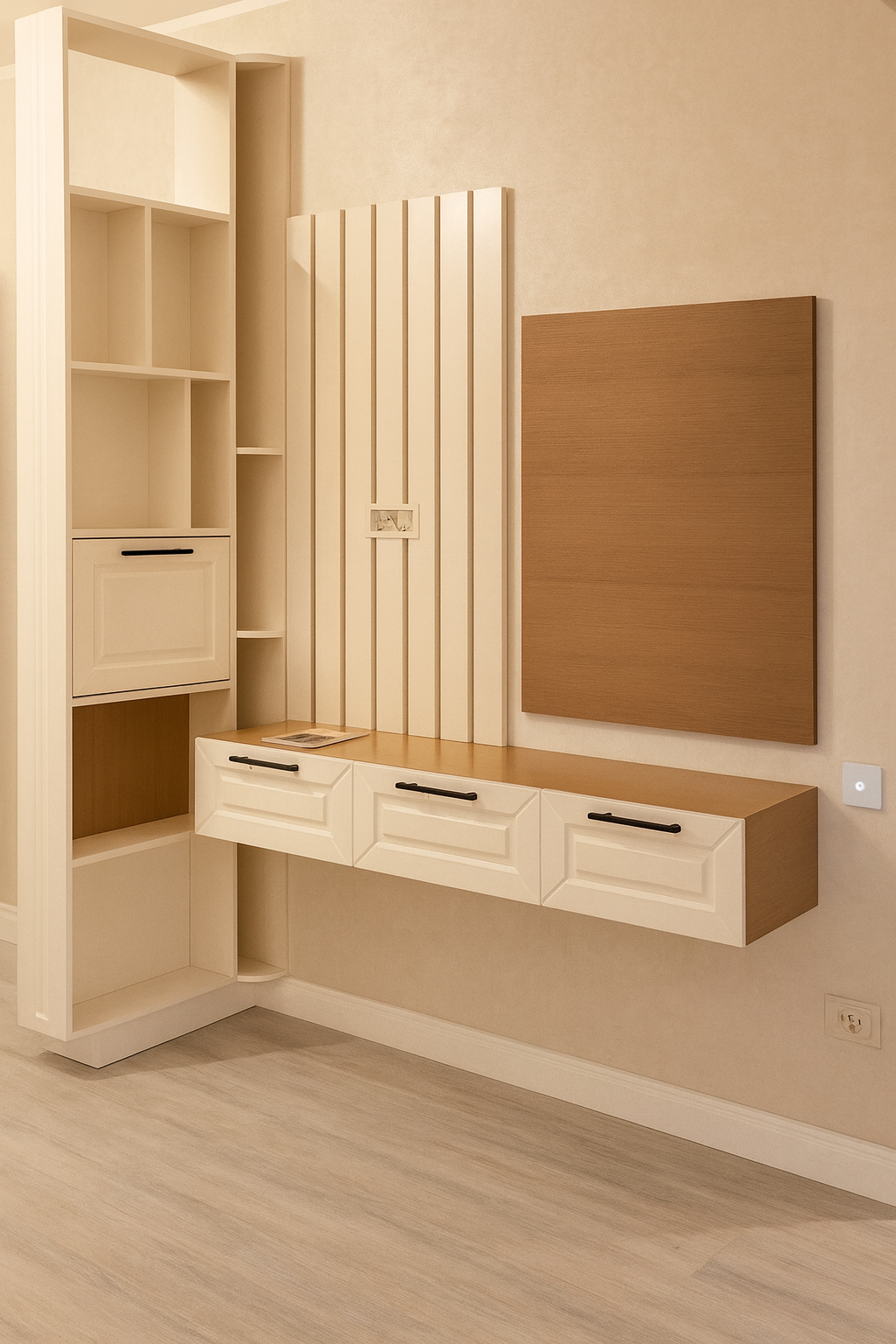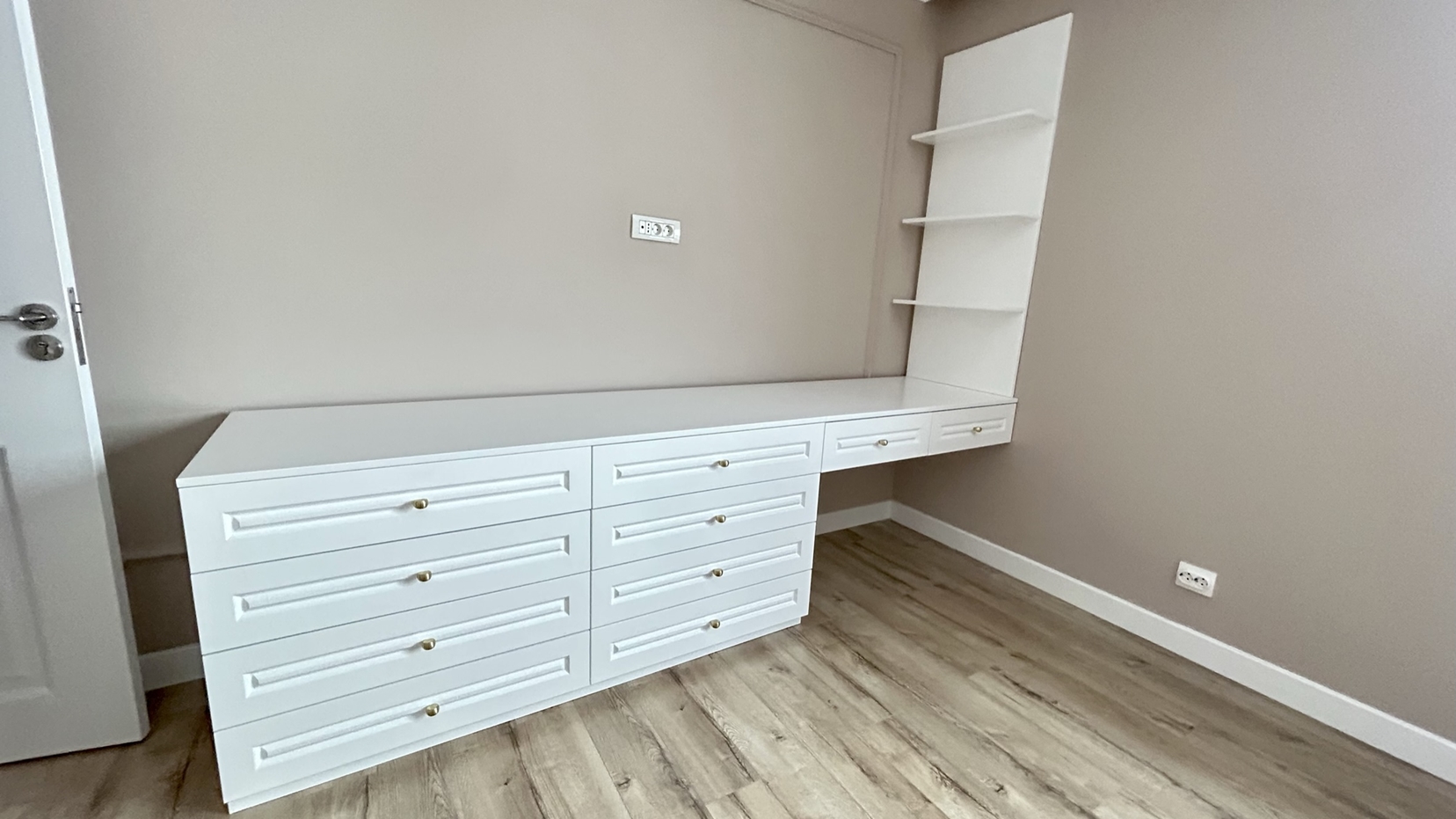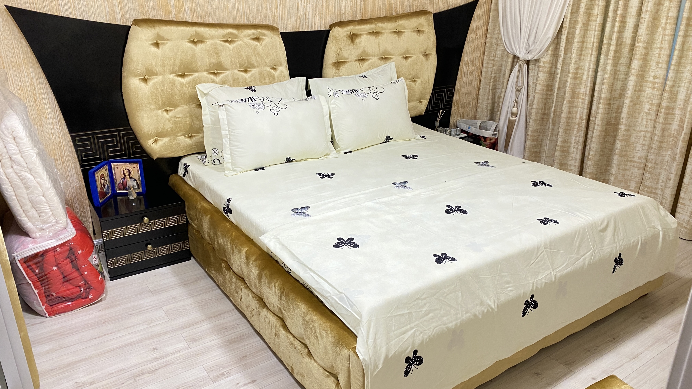 Caracterizat prin linii drepte și elemente decorative într-o simetrie ordonată, dormitorul devine locul preferat atunci când dormim sau ne încărcăm bateriile. Patul, cu eleganța sa, devine piesa centrală a dormitorului, invitând la relaxare și un somn liniștit. În același timp, poziționarea strategică a dressingului, care se abate de la tiparul tradițional, completează organizarea eficientă a spațiului de depozitare.